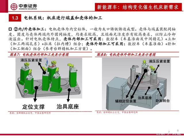 ③电机变速器端盖/底壳加工:其一般为压铸铝合金材质压铸成型。由于其为薄壁类零件, 在装夹时容易变形,因此在加工时,需要选择合理的夹紧、定位点,控制切削力大小。同时, 变速箱孔系位置度要求更高,连接孔和连结面较多。因此可采用工序相对集中的方法,即立 加(加工两端面)+卧加(加工侧面和处理表面)组合来实现高效加工(参考台群精机加工方 案) 。