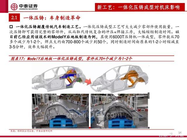 一体化压铸颠覆传统汽车制造工艺。一体化压铸成型工艺可大大减少零部件使用数量,一 次压铸即可获得完整的零部件,从而取代传统复杂的冲压+焊接工序,大幅缩短制造时间。以 目前已经应用该技术的ModelY后地板制造为例,其使用6000T压铸机一体成型,零件数从70 多个减少为1-2个,焊点大约由700-800个减少到50个,同时制造时间由原来的1-2小时缩减至 3-5分钟,效率大幅提升。
