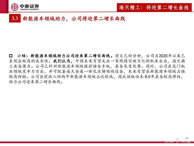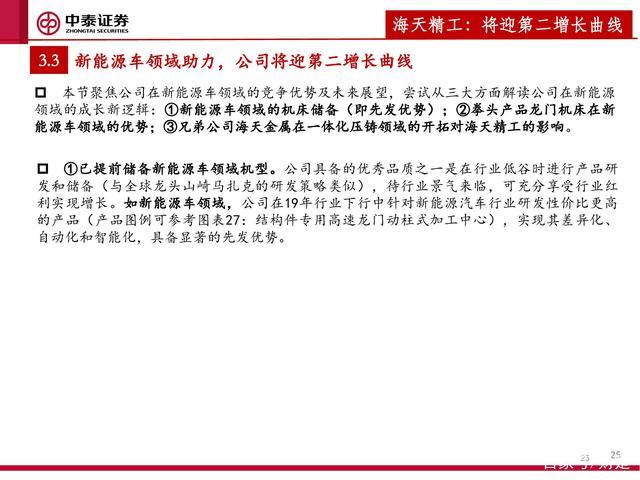 公司层面:①机床产品竞争力突出,国内第一梯队,比肩台韩(前文已分析,不在赘 述)。②经营战略调整效果凸显。小型批量化的立加的产销量在2020年迎来高速增长(销量 同比增长192%),对应的子公司大量国华大幅扭亏,并实现盈利;③具备产能优势。在行业 高景气+进口替代加速的背景下,产能决定订单和业绩弹性。机床领域正常的产能扩张周期在 一年半以上,2020Q2行业强劲复苏以来,多数机床公司新建产能目前仍未释放,而海天精工 原有产能较大,可支持其大量接单,是行业为数不多的充分享受到行业高景气红利的公司。 2020年以来公司已经表现出较高的成长性,2019-2021年,保守收入CAGR为43.47%,净利润 CAGR为77.65%(2021年收入和净利基于我们的盈利预测),远高于行业平均水平。同时,未 来产能扩张周期短,产能制约因素小;④营销策略调整效果凸显。经销商利益与各类产品销 售直接挂钩,保证公司四大类产品可同步放量。