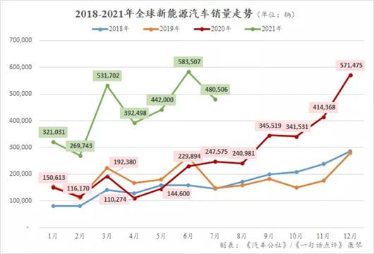 在持续走高之后,今年1月至7月全球新能源总销量已达到3,039,961辆,仅比去年全年的3,124,793辆少84,832辆,同比增幅超过150%。这意味着,今年前8个月的累计销量就会超过2020年全年。