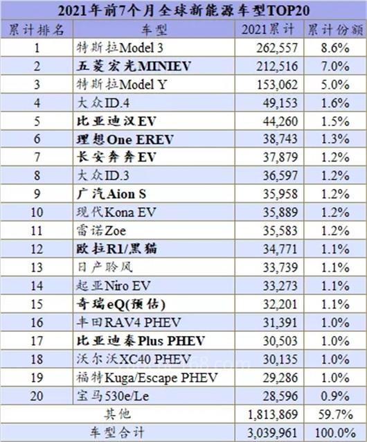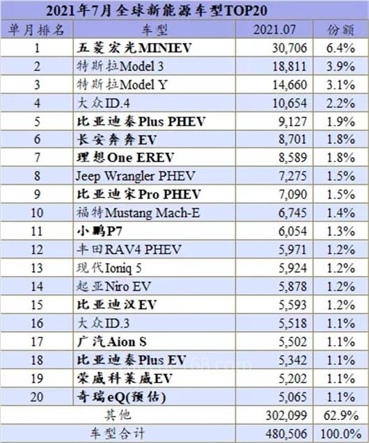从该榜单中可以看出,7月有11款是中国品牌的车型,而且由于季度初特斯拉进入“低调”状态,五菱宏光MINIEV又一次获得冠军,小鹏P7、比亚迪宋Pro PHEV和秦Plus EV也赫然在列。此外,Jeep Wrangler PHEV和福特Mustang Mach-E也跻身7月单月畅销车型前十中。
