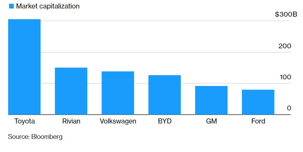 当日,Rivian的股价上涨了15%,市值上升到1530亿美元,超过大众汽车(1390亿美元),使其成为仅次于特斯拉和丰田的全球第三大汽车制造商。在当日的交易中,Rivian的市值甚至超过了90%的标准普尔500指数公司,其中包括高盛、波音、花旗、星巴克和卡特彼勒。