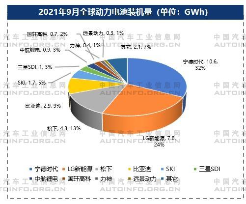2021年9月,全球电动车电池装机量约32.9 GWh,同比增长94%,在Top 10榜单中,中国有六家电池制造商上榜,其中宁德时代仍居榜首,力神以422.2%的涨幅登上榜单。