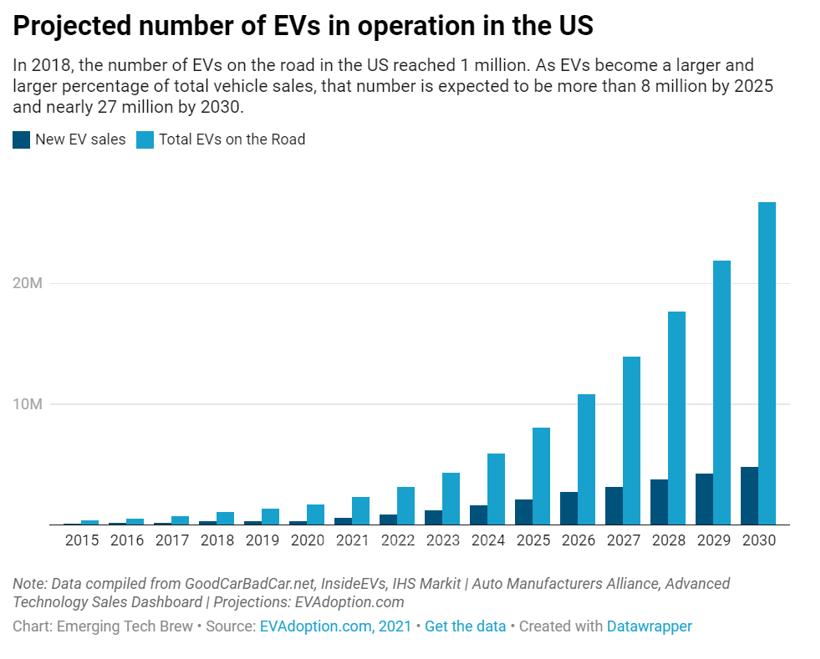 尽管横向比较略显滞后,但纵向来看,美国电动车市场依然可期。三年前,美国电动车保有量还不到100万辆。随着电动车在汽车总销量中的占比越来越高,分析师预计到2025年,这一数字将超过800万辆;到2030年,美国上路的电动汽车将达2700万辆,电动汽车购买量将占汽车总销量的20%至30%。