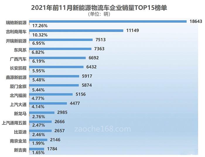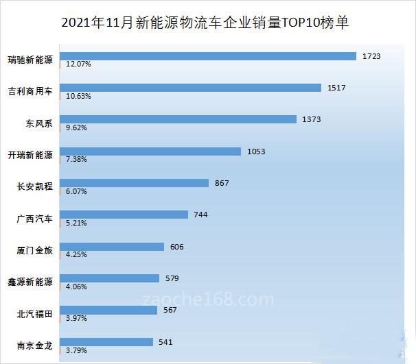 前11月新能源物流车销量排行榜:瑞驰/吉利破万 开瑞/东风系不相上下