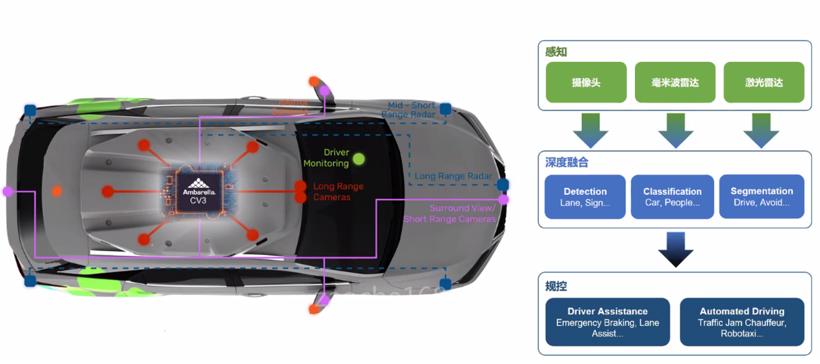 为继续发挥安霸在图像处理领域的领先优势,CV3 系列亦搭载了其最新一代 ISP,可同时支持 20 路摄像头通过 MIPI VC 方式连接,并可以接入激光雷达、毫米波雷达、超声波雷达等自动驾驶传感器,进行多传感器的深度融合,通过单颗芯片实现 ADAS到L4 不同等级自动驾驶系统的研发。