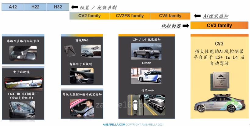 除此之外,在图像处理和压缩以及AI加速算法等领域,安霸也积累了丰富的经验。尤其是图像处理,安霸已经拥有17年的研发经验,基于此安霸已经先后推出了多款基于视觉感知的车用芯片,包括不带AI处理器的A12、H22、H32,以及加入了安霸独有AI加速引擎设计的CV2x系列、CV5等。