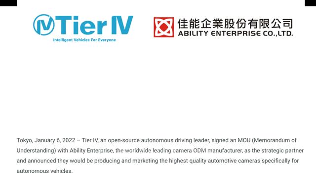 近日,开源自动驾驶公司Tier IV与佳能签署合作备忘录,双方将共同开发L4级自动驾驶技术,同时将为Tier IV生产专用车载摄像头。除此之外,佳能还将投身于驾驶监控系统(DMS)的研发,该系统可利用摄像头来实时监测驾驶员的行为,实现疲劳驾驶提醒等多种辅助驾驶功能。