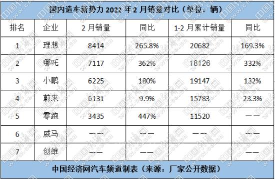 数据显示,2月,理想、哪吒、小鹏、蔚来和零跑的销量分别为8414辆、7117辆、6225辆、6131辆、3435辆,同比分别增长265.8%、362%、180%、9.9%、447%;前2个月的累计销量分别为20682辆、18126辆、19147辆、15783辆、11520辆。