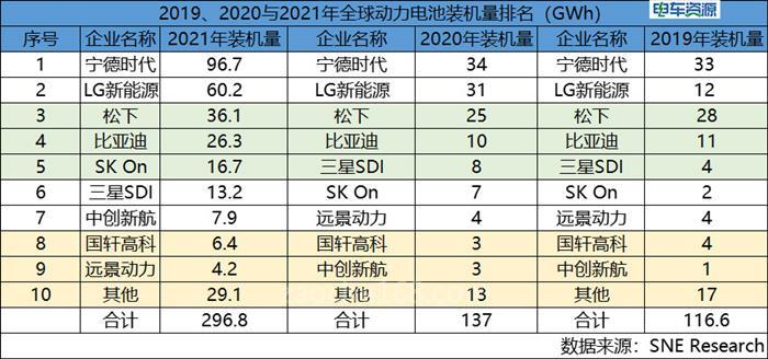 日前,韩国机构SNE Research公布了2021年全球动力电池的总装机量。数据显示,2021年全球动力电池总装机量为296.8GWh。