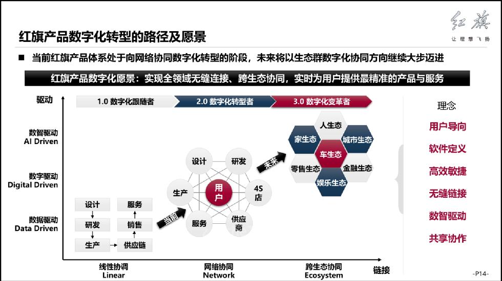 从数字化转型发展的三个阶段来看,目前红旗产品体系正处于向网络协同数字化转型的阶段,未来将以生态群数字化协同方向继续大踏步迈进,整体运营就是实现全领域无缝连接,包括跨生态协同,实时为用户提供最精准的产品服务。
