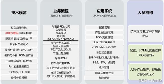 构建全新的满足定制化需求的车型配置选装管理模式;基于中央制造BOM集中管控,实现面向多基地生产的制造管理模式;打通上下游(工程、制造、售后)协调一致的的变更实施管控机制;基于售后工程介入工程方案评估的同步工程设计模式。