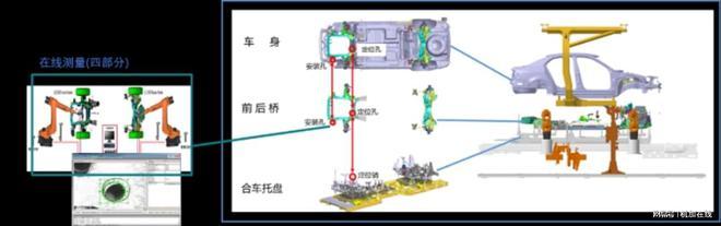 广州工厂首先以底盘全自动合装为项目试点,开发了一套数据互联互通应用方案。车身车间布置在线蓝光检测设备,测量每台车的尺寸数据;总装在前后桥区域布置在线测量工作站,测量每台前后桥总成的安装孔位尺寸;托盘缓存区布置蓝光检测设备,测量托盘定位销尺寸数据;测量数据经过编码标识后,通过MES系统上传至智能匹配系统中,与质量数据管理系统上传来的来料数据一起,通过匹配算法,虚拟计算自动合装尺寸匹配状态,将结果输出至工位上,提前应对解决。