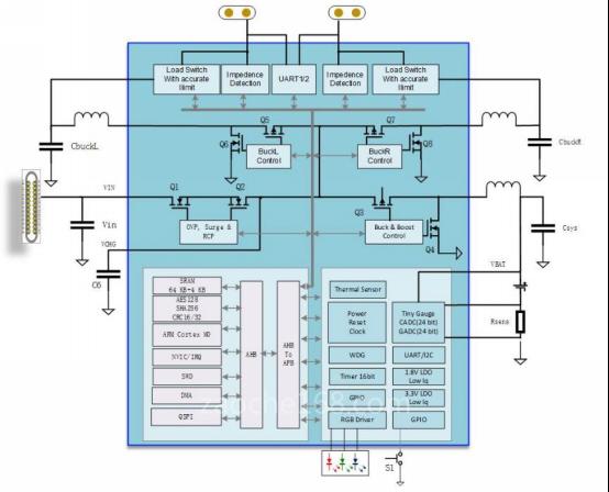 TCPT22集成了包括MCU、Buck、Boost、高精度电量计、保护电路、耳机通讯、出入和检测及硬件加密等功能。高效同步整流Buck 充电和同步整流Boost + Buck放电电路,可实现充电仓电池高达5C 和耳机端电池高达10C 的快速充电,在对耳机充电时,两路耳机的供电电压和电流可以独立控制,除可以实现恒压供电外,也可以实现电压跟随或恒流恒压控制实现耳机电池的直流快充,在实现快速充电的同时控制耳机的发热量,充分满足充电仓和耳机的快速补电和长续航需求。该方案还集成了耳机出入盒检测和单线通讯必需的开关和电平转换电路以实现耳机同充电仓之间快速通讯和固件的在线更新,并且灵活支持2触点和3触点耳机接口。基于芯片内部的高精度电压测量和电流测量信号链路和ADC,可以精确估计充电仓电池容量。