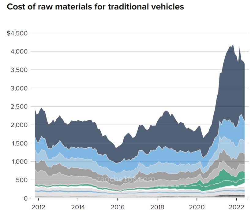 不过,成本上涨的不仅仅是电动汽车,在新冠期间,传统内燃机汽车的原材料成本也增加了一倍多,达到每辆3,662美元,比2020年3月每辆1,779美元的平均水平增长了106%。钢铁和铝的价格上涨是这一增长的主要原因。