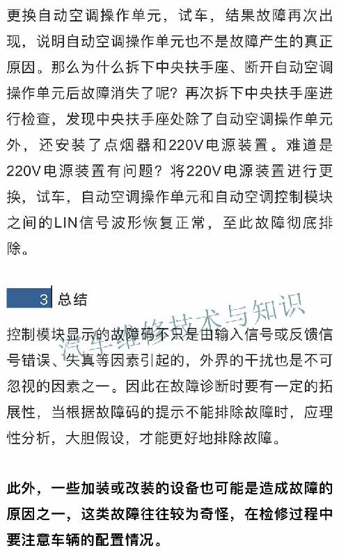 由此可判断后部自动空调操作单元通过LIN总线向自动空调控制模块发出了错误的信号,影响了自动空调控制模块的数据分析功能,产生错误的故障码,并且为了保护自动空调系统,自动空调控制模块断开空调压缩机,制冷功能失效。