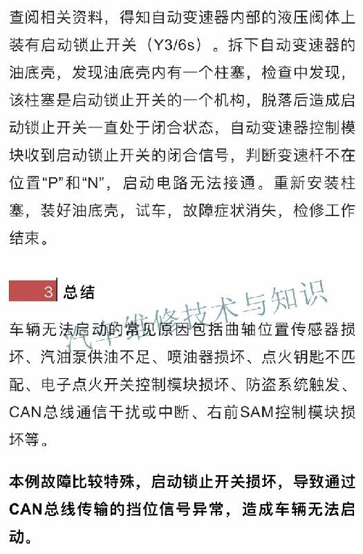 检查起动机的线路连接情况,正常。直接向起动机供电,起动机能运转,起动机损坏的因素被排除。用万用表测量起动机的控制线电压,在启动过程中控制线没有工作电压。查阅相关资料,得知右前SAM控制模块将启动信号传送至右前熔丝/继电器模块(K40/7),使起动机继电器吸合,起动机继电器向起动机提供工作电压,起动机运转。测量起动机继电器与起动机之间的线路,正常。检修至此,可以判断右前SAM控制模块没有收到启动信号。