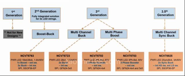 安森美已开发了4代SPI-LED驱动产品。第2代是Boost-Buck芯片NCV78763,第3代有多通道的Buck芯片NCV78723和多相Boost芯片NCV78702、NCV78703,最高输出电压达60 V,是目前市面上同类型产品中电压输出能力最高的,第3.5代是多通道同步整流Buck芯片NCV78825,驱动电流能力可达3 A,也是目前市面上同类型产品中电流驱动能力最大的。第3代以后的产品适用于3组以上的LED灯串。