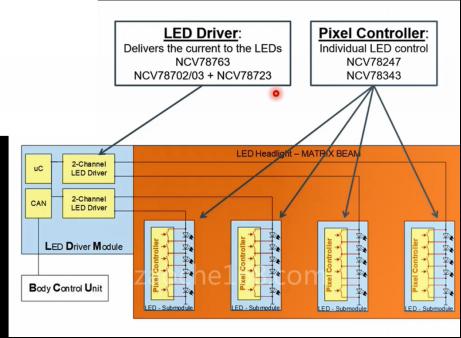 高级矩阵/像素灯组在多种驾驶场景中使前大灯功能最优化,包括照射更长距离,转弯时光束可切换,同时更清晰地照亮道路中的行人和障碍物,尽量减少对向车辆产生的眩光,可根据需要控制单颗LED像素的开关,且包含安全诊断和车联网等功能。图4是安森美的像素/矩阵灯组应用框图的一个例子,由4个LED灯串组成。