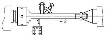 生产时,采用零件端用自定心卡盘夹紧,另一端用螺纹回转顶尖拉制的加工方式,走刀方向为从机床主轴向尾座即反向走刀,用自定心卡盘跟刀架辅助支承,在车削中跟刀架随着刀具纵向进给,能很好地起到支承作用。零件加工示意如图2所示。用此法加工的细长杆类工件,能解决加工过程中由于切削热而产生的线膨胀变形和径向切削力带来的弯曲变形,反向走刀可以使工件受一个与切削力方向一致的轴向拉力,使工件不被甩弯。
