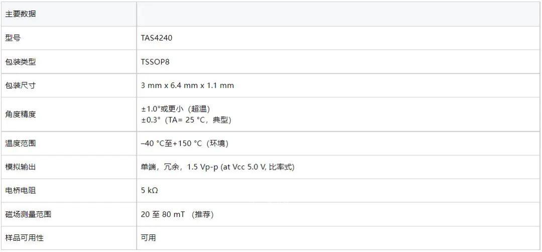 作为一款360°角度传感器,TAS4240非常适合于精确测量关键安全应用中BLDC电机的转子位置,如动力转向、制动助力器或牵引电机。*该传感器拥有四个TMR半桥,能够提供双路独立正弦/余弦输出。系统可以实现上至ASIL D的高安全级别,即使在有一路输出失效时也能保证很高的位置信息可用性。该传感器还可以为故障运行理念提供支持,具体取决于系统架构。
