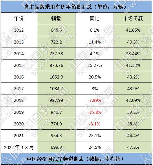 得益于在新能源领域闯出了一条“销量上升、品牌向上”的新路子,自主品牌的销量在今年呈现持续增长的状态。最新数据显示,8月,自主品牌乘用车的销量为102.9万辆,同比增长45.3%,占总量的48.4%;前8个月累计销售699.8万辆,同比增长24.5%,市场份额为47.8%。