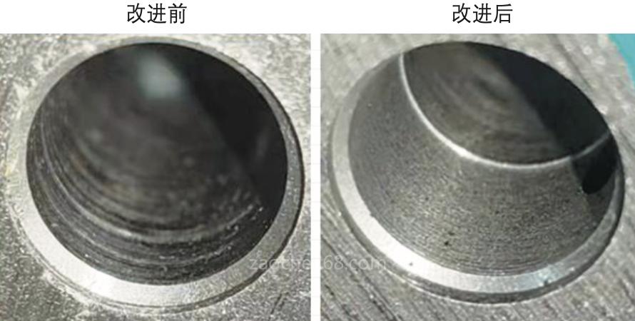 根据产品设计方确认,抽芯铆钉不能进行直径更改,故要预留铰削余量必须对孔口的直径 进行缩小。在保留孔口直径匹配 抽芯铆钉不变的情况下,需对引导孔和深孔麻花钻的刀具进行变更。经过和刀具工程师、产品设计工程师确认,引导直槽钻直径从φ16.18mm(H7)改为φ15.73mm(H7),深孔麻花钻直径从φ16.15mm(H7)改为φ5.7mm(H7),铰刀直径设计为φ16.2mm,铰削长度为15mm。改进后的直槽钻、麻花钻、铰刀装用机床进行铰削加工实验。实验共加工58件,未发现异常螺旋刀纹工件。经过数据统计分析,改进后孔径的能力数据,改进前后的主油道孔孔内照片如图5所示。通过在麻花钻后增加铰刀的加工方式,问题得到解决。