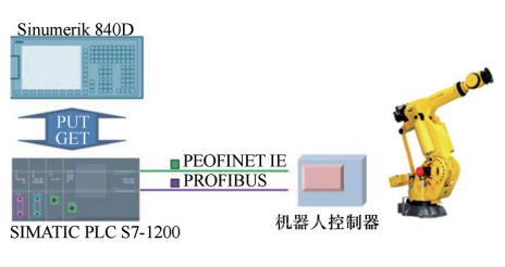 加工时,操作人员只需要按下机床启动按钮,机床就会发出“上料请求”信号,同时机器人检测机床是否处于安全位置,如机床处于安全位置且接到“上料请求”信号,则机器人进行上料。当机器人上料完成并完全离开机床后,会向机床发出“上料完成”信号,机床收到“上料完成”信号后夹紧夹具并关闭防护门,开始自动加工。当机床加工完成后,自动打开夹具和防护门,请求机器人下料,下料完成后再请求机器人上料,从而进行下一循环的加工。机器人与机床数控系统的PLC连接如图1所示[3]。