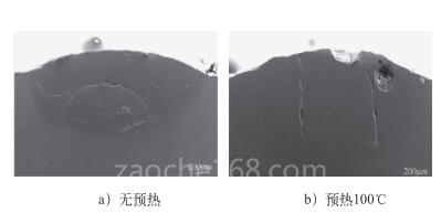 由图4可知,随着预热温度的提高,熔覆层裂纹呈下降趋势,预热200~300℃时熔覆层的裂纹数量明显减少。黄雪等利用激光熔覆技术在304不锈钢基体表面制备Co基合金并加入30%或60%的WC混合粉末的激光熔覆层时,利用电阻炉对基体进行500℃的预热处理,使加入30% WC的Co基合金涂层裂纹全部消除,加入60% WC的Co基合金涂层裂纹由多条减少到仅有6条,如图5所示。