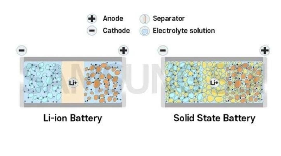 相比液态电池,固态电池把液态电解质替换为固态电解质,同时取消了隔膜。也就是说,固态电池只有正极、负极以及电解质,结构更简单。