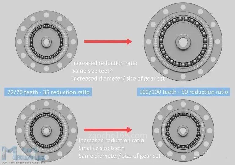 因此,以挠性花键上的200个齿和圆形花键上的202个齿为例,减速比为-0.01。这是波发生器速度的1/100,减号表示输出方向相反。