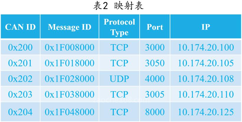 参见图1以及表2,通过设置微处理控制器(MCU),在微处理控制器的两端设置CAN接口和车载以太网接口,微处理控制器负责对CAN数据包、车载以太网数据包的解析,并根据需求封装成对应CAN数据包或车载以太网数据包;微处理控制器包括SOME/IP传输模块、CAN传输模块、映射表处理模块,映射表处理模块连接SOME/IP传输模块和CAN传输模块,用于对SOME/IP协议的信号与CAN协议的信号之间的相互转化进行解码;映射表处理模块包括CAN地址识别码(CAN ID)与SOME/IP的Message地址识别码(Message ID)对应映射表;映射表还包括SOME/IP的信息地址识别码与传输终端的地址、服务端口号等信息。