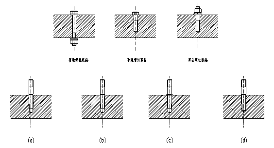 (d)利用螺柱顶部结构,抵紧螺纹孔底面,构成轴向固紧。