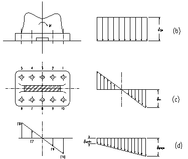 图(d)为不考虑受载螺栓预紧力变化时,翻转力矩产生应力与预紧力合成后,挤压应力的分布图。由图看出,接合面左边缘挤压应力最小,右边缘挤压应力最大。