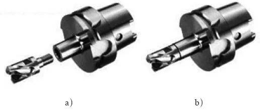 2)用螺纹连接模块化刀具的HSK刀柄。为实现工序集中,提高加工效率,在模具加工中一些刀具厂商开发了用螺纹连接模块化刀具的HSK刀柄。下面以三菱公司的产品为例来作说明。三菱公司目前使用的为HSK63A刀柄,其刀头装拆如图2所示,其螺纹部分尺寸是M8~M16,所装立铣刀刀头均是多功能带可转位刀片的,刀头尺寸一般为φ16~φ40mm。装上可转位刀片的立铣刀头的精度虽不及精密的整体立铣刀,但不需重磨,转位后可继续加工。随工件材料不同可更换不同材质的刀片,不同的切削条件尚可选择不同的断屑槽刀片,一种刀头能加工多种型面,当某种型面采用一种刀头不能加工时,可迅速换上另一种刀头,故能在粗加工和半精加工中提高加工效率。