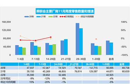 11月第一周至第三周,总体狭义乘用车市场零售日均分别为3.6万辆、4.0万辆、5.2万辆;同比增速由第一、二周的分别下降9%、12%,转为第三周的上升8%。同时,总体狭义乘用车市场批发日均分别为3.9万辆、4.1万辆、5.9万辆,同比分别下降2%、16%、5%。