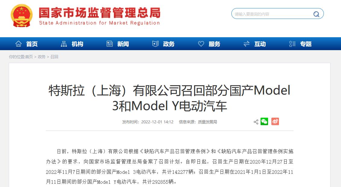 12 月 1 日消息,据国家市场监管总局网站,特斯拉(上海)有限公司日前根据《缺陷汽车产品召回管理条例》和《缺陷汽车产品召回管理条例实施办法》的要求,向国家市场监督管理总局备案了召回计划。