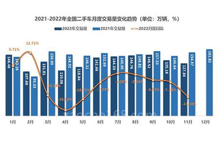 根据中国汽车流通协会日前公布的数据,2022年11月全国二手车市场交易量为127.84万辆,环比下降5.43%,同比下降17.18%,交易金额为769.38亿元;1-11月累计交易1461.15万辆,同比下降8.5%。流通协会预计12月全国二手车交易量将在132万-134万辆之间,高于11月。