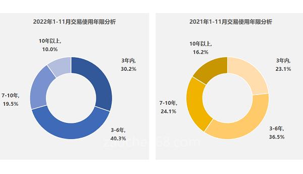 除销量外,二手车的保值率也是绕不开的话题。由于二手车年限特征明显,车龄对车价影响较大。从消费者偏好看,2022年1-11月,3-6年车龄的二手车交易占比40.3%,3年内车龄二手车占比30.2%。新能源方面,4年以内车龄二手车占比更是达到80%以上。