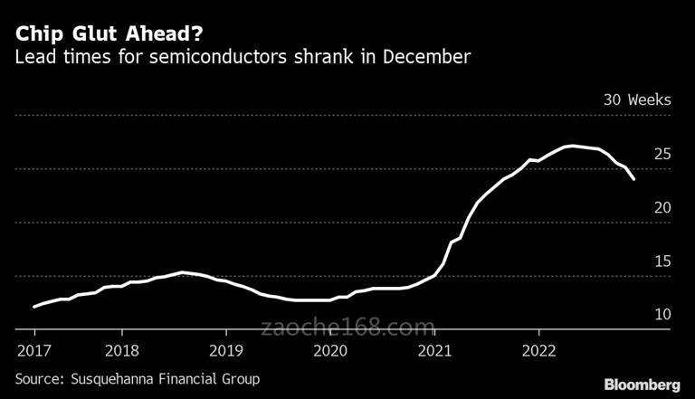 首先,从全球整个芯片行业来看,也有一些芯片供应转好的消息传来。Susquehanna Financial Group的数据显示,自2022年6月以来,全球芯片平均交付周期(芯片从订购到交付的周期)一直保持下跌的趋势,芯片交付时间也在加速缩短。Susquehanna最新的研究显示,去年12月份,全球芯片平均交付周期约为24周,缩短了8天。