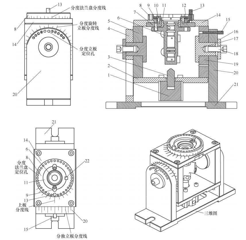 该夹具采用两组不同角度的分度线的组合,不仅实现了绕水平轴和垂直轴旋转定位,而且实现了某种产品不同位置的分度定位,以及1°为单位的任意角度旋转定位,满足了装夹定位或生产加工的需要。该机构能够代替传统分度定位方式所需要的大量夹具,结构紧凑实用,定位准确可靠,调整方便快捷,调整效率提高80%以上,减少了夹具制造的成本,便于工装夹具的使用管理。该夹具的设计原理对其他产品类似加工位置的装夹机构也有很好的借鉴作用。