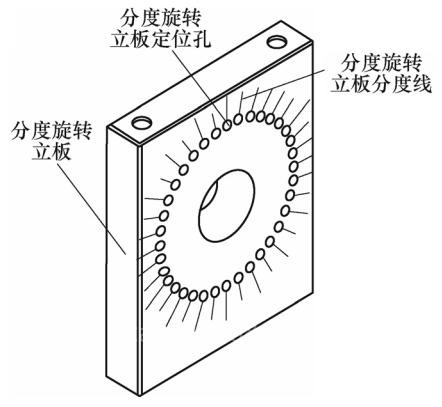参见图3、图6和图7,分度立板的圆弧表面刻有分度立板分度线,圆周位置钻有11个11°分度立板定位孔。在分度旋转立板的圆周上以10°为间隔,均布36个分度旋转立板定位孔和分度旋转立板分度线,当某个分度立板定位孔和某个分度旋转立板定位孔对齐时,长分度定位销可穿过相应对齐的分度立板定位孔和分度旋转立板定位孔,分度旋转立板和分度立板之间位置固定,拧紧锁紧螺栓后,轴销和垫片将分度旋转立板和分度立板锁紧,两者之间不能转动,完成分度定位。