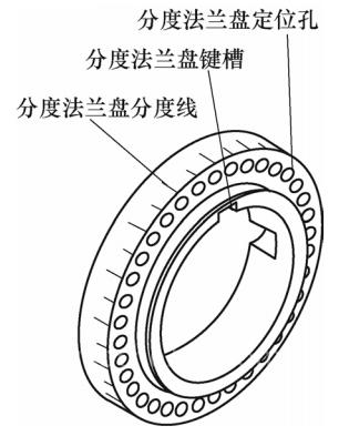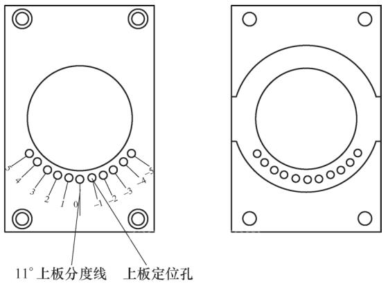 参见图3、图8和图9,上板圆周位置刻有11条11°上板分度线,在上板分度线对应位置钻有11个上板定位孔。分度法兰盘上刻有36条10°均分的分度法兰盘分度线,对应分度法兰盘分度线位置钻有36个分度法兰盘定位孔。当上板和分度法兰盘之间的某个上板定位孔和某个分度法兰盘定位孔对齐时,短定位销插入到上板定位孔和分度法兰盘定位孔中,上板和分度法兰盘之间不能旋转,拧紧锁紧螺钉,定位法兰盘和分度法兰盘被锁紧在上板上,完成分度定位。
