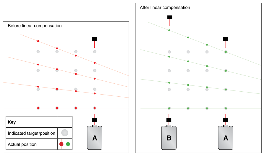 如图2所示,在A处采用单光束激光检测某一轴的定位精度并补偿合格后,由于运动平台的多自由度误差的作用,使得在同一运动轴的在其它部位所得到的定位精度并不一定能满足精度要求,如图2所示,在A位置进行螺距误差补偿后B位置测量的误差还是没有解决。