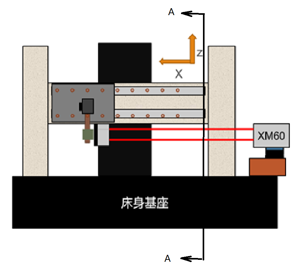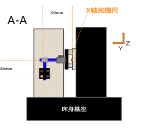 • 以激光光束处为参考,X轴光栅尺安装位置在Z向距离激光偏置约60mm
