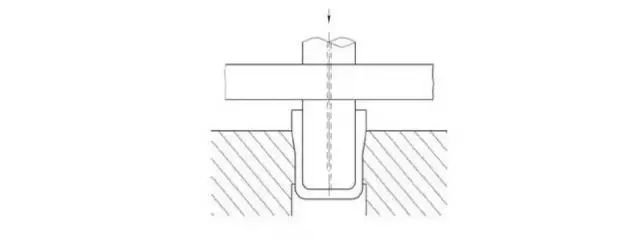 13、台阶拉伸加工(Step drawing):将左侧初拉伸产品进行再拉伸加工,成形为右侧的台阶形底部。深度较深的部分在拉伸成形的初期就产生变形,深度较浅的部分在拉伸的后期产生变形。在台阶变化部分的侧壁易诱发切应力产生变形。