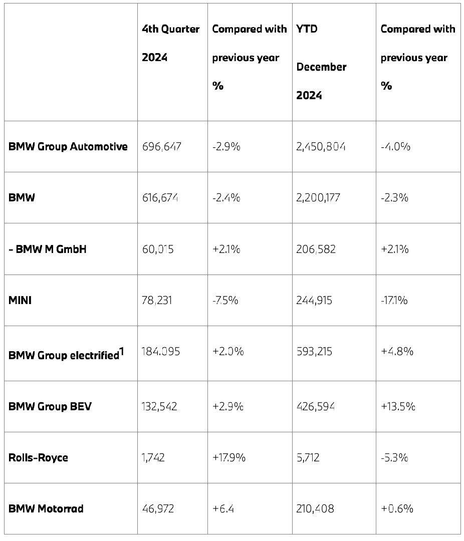 先来看看宝马集团,2024年宝马集团全年销量245.1万辆,同比下滑4%,其中宝马品牌销量为220.0万辆,同比下滑2%,MINI品牌为24.5万辆,同比下滑17%,劳斯莱斯品牌为5712辆,同比下滑5.3%。另外,宝马电动化车型销量为59.3万辆,同比增长5%,其中纯电动车销量为42.7万辆,同比增长13.5%。