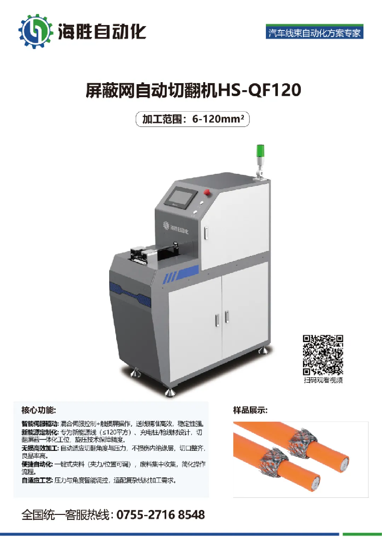加工范围6-120mm²,专为新能源线(≤120平方)、充电桩/枪线材设计,切翻屏蔽一体化工位,旋压技术保障精度。
